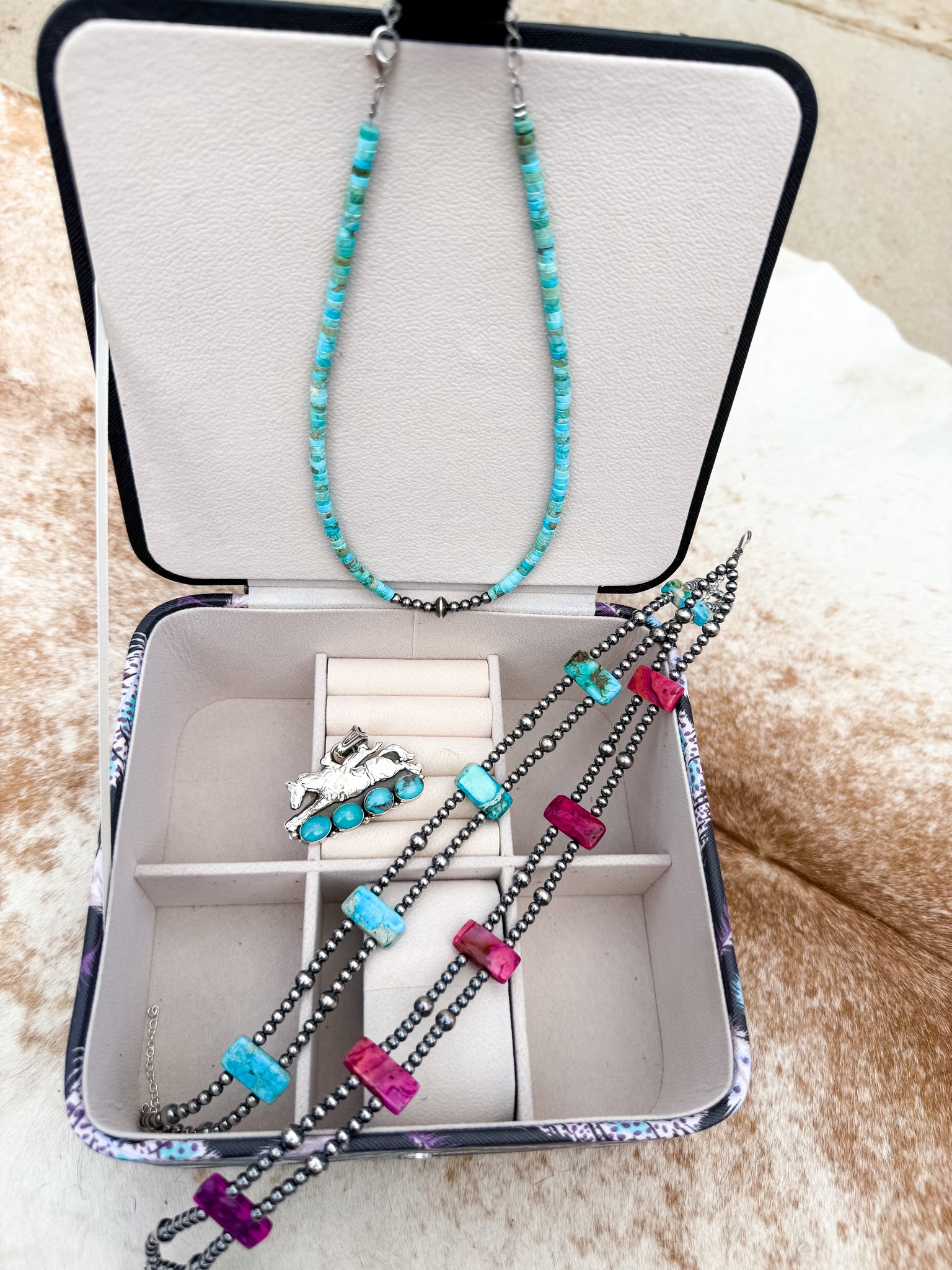 This double strand choker-style necklace measures 13 inches with an extender and is crafted with 4mm and 6mm sterling silver pearls. It features stunning rectangle variscite PINK or TURQUOISE Β beads with rich, earthy tones. Though it may look compact when hanging, it lays beautifully on the neck once worn. Finished with a sterling silver lobster clasp and extender. Limited edition β only a few were made.