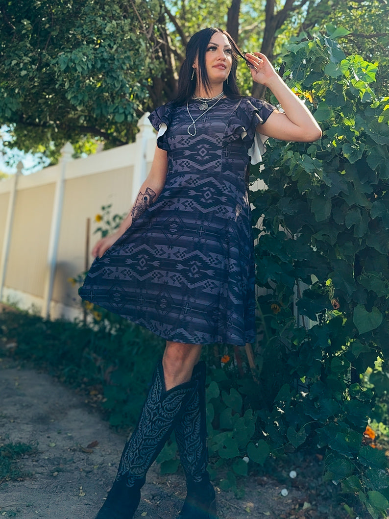 A striking blend of western edge and timeless femininity, the No Man’s Land Dress is made for the woman who walks her own trail. Crafted from a subtly stretchy fabric that moves with you, this dress features a flattering A-line silhouette, flutter sleeves, and a bold southwestern-inspired print.