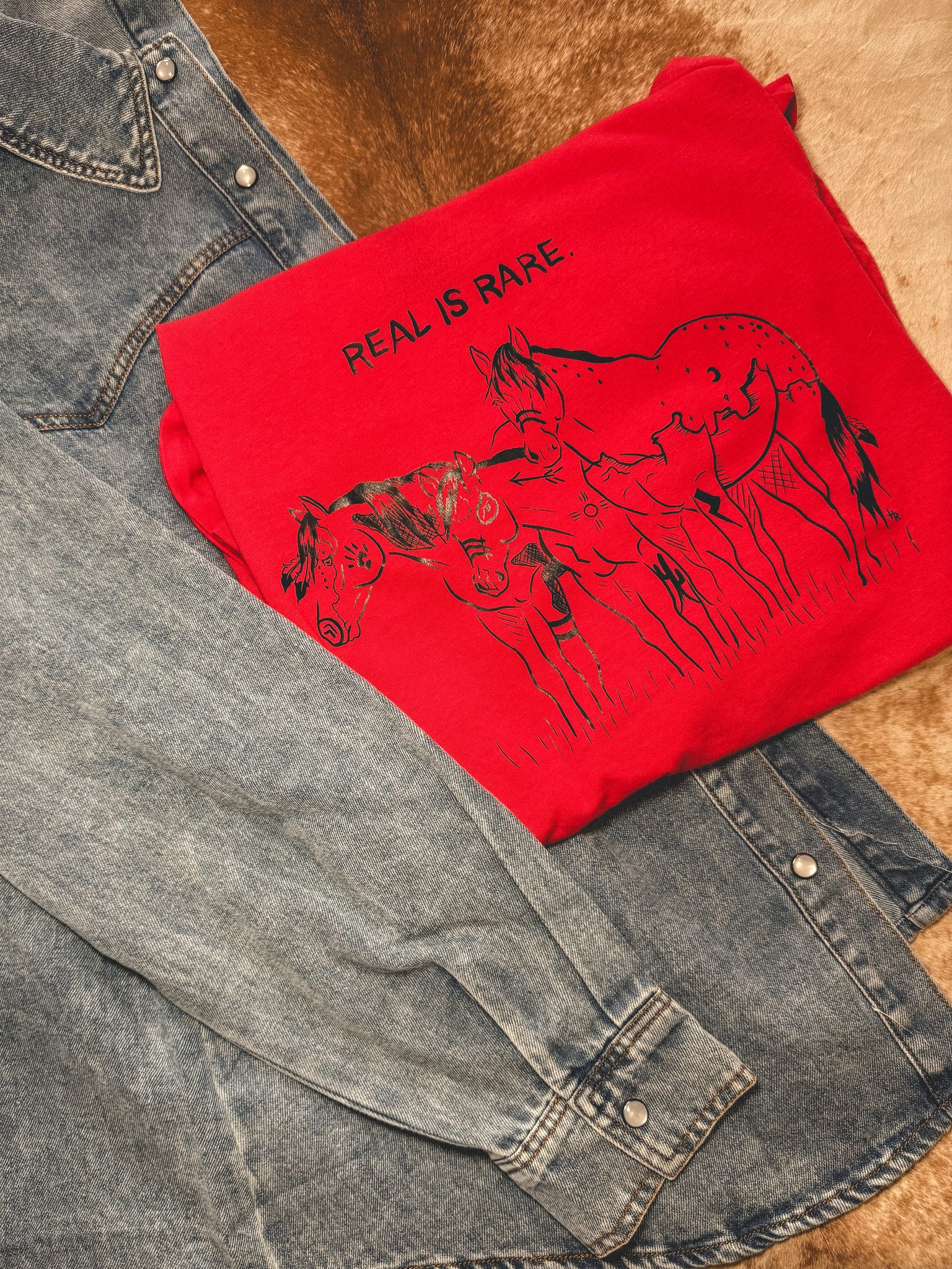 Real is Rare! Our one of a kind hand drawn art on a red long sleeve tee. Less bulky than a crewneck, but keeps you warm. A great piece to layer or wear alone. Unisex fit, 100% cotton.Β