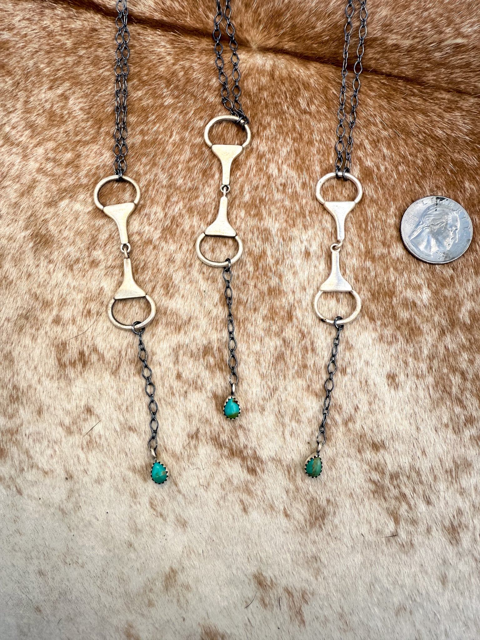Sterling silver snaffle bit with a single Kingman Turquoise stone in a lariat style. Length is about a 28” but can easily be shortened with the clasp. On a silver chain. Stone color may vary. This is a non native made piece & is from the HaDa collection. Stamped with HaDa.