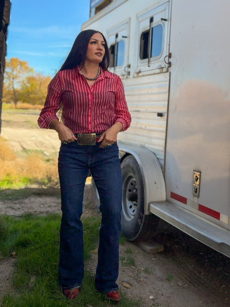 Your choice of red or black pinstripe button up. Light slight see through material with cuffs and collar. Pair with quarter zips, blazers, or crewnecks. So many style options with this closet staple. Running true to size, if busty or broad size up.