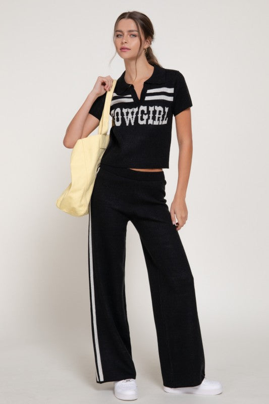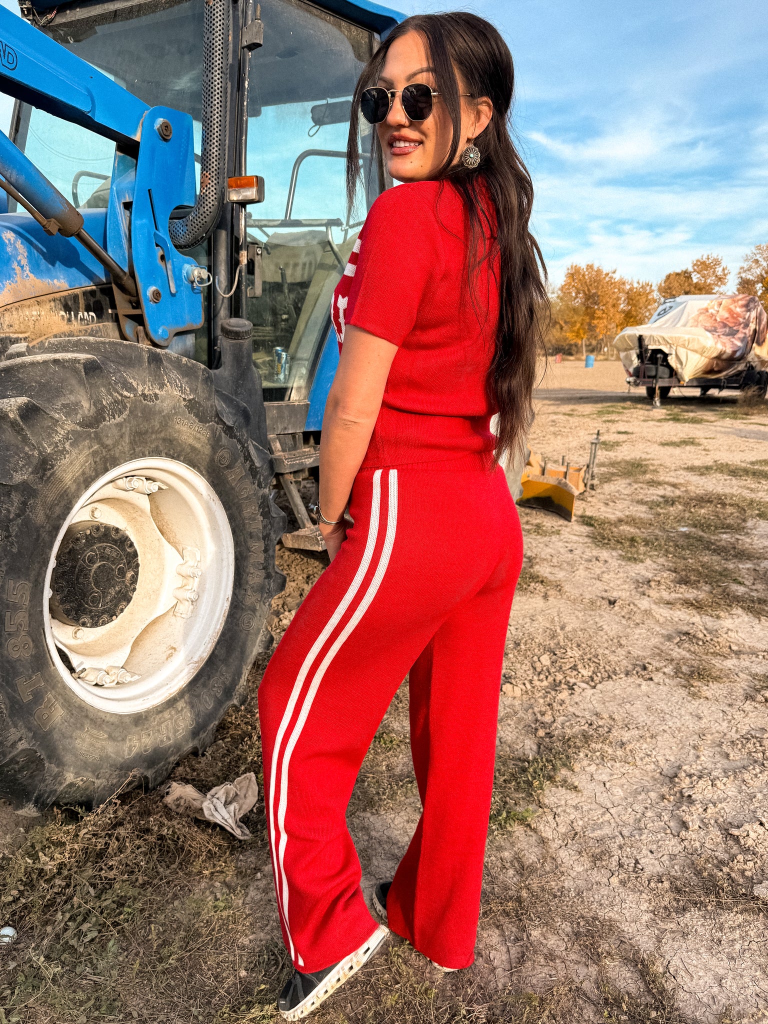 The most adorable knit lounge set in red or black. The top is collared for an elevated vibe. These are fitted with slight stretch so it’s recommended to stick to your normal sizing. Inseam on the bottoms is a 32”. Model is a size 6 wearing the medium for reference. If busty or broad size up.